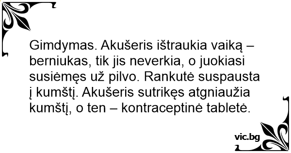 Gimdymas. Akušeris ištraukia vaiką – berniukas, tik jis neverkia, o juokiasi susiėmęs už pilvo. Rankutė suspausta į kumštį. Akušeris sutrikęs atgniaužia kumštį, o ten – kontraceptinė tabletė.