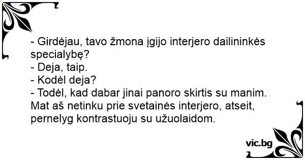 - Todėl, kad dabar jinai panoro skirtis su manim. Mat aš netinku prie svetainės interjero, atseit, pernelyg kontrastuoju su užuolaidom.