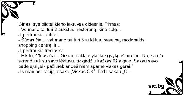 - Eik tu, šūdas čia… Geriau paklausykit kokį įvykį aš turėjau. Nu, karoče skrendu aš su savo lėktuvu, tik girdžiu kažkas ūžia gale. Sakau savo padejejui „eik pažiūrėk ar dešiniam sparne viskas gerai.“