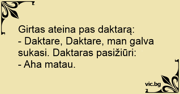 - Daktare, Daktare, man galva sukasi. Daktaras pasižiūri: