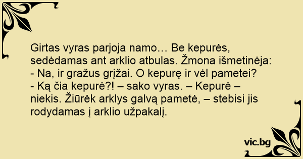 - Ką čia kepurė?! – sako vyras. – Kepurė – niekis. Žiūrėk arklys galvą pametė, – stebisi jis rodydamas į arklio užpakalį.