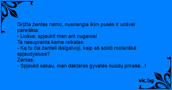 - Uošve, spjaukit man ant nugaros!