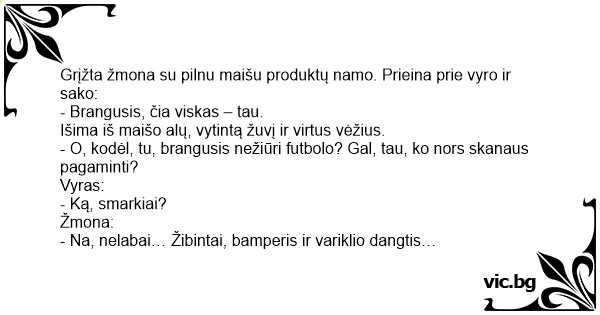 - O, kodėl, tu, brangusis nežiūri futbolo? Gal, tau, ko nors skanaus pagaminti?