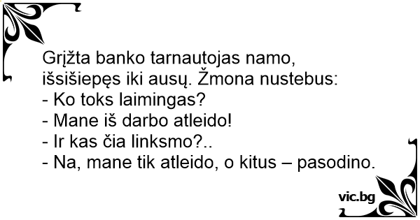 Grįžta banko tarnautojas namo, išsišiepęs iki ausų. Žmona nustebus: