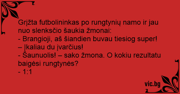 - Šaunuolis! – sako žmona. O kokiu rezultatu baigėsi rungtynės?