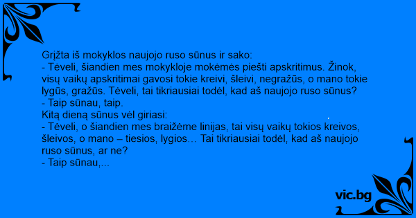 - Tėveli, o šiandien mes braižėme linijas, tai visų vaikų tokios kreivos, šleivos, o mano – tiesios, lygios… Tai tikriausiai todėl, kad aš naujojo ruso sūnus, ar ne?
