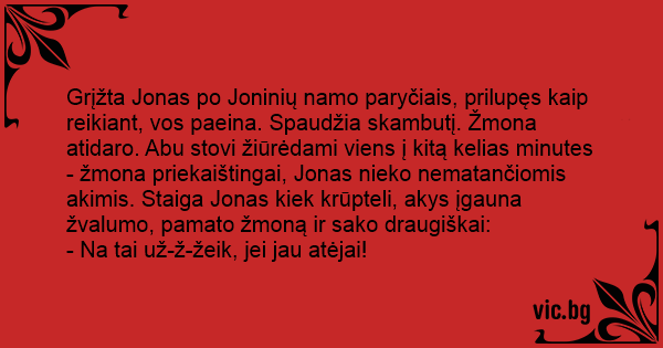 Grįžta Jonas po Joninių namo paryčiais, prilupęs kaip reikiant, vos paeina. Spaudžia skambutį. Žmona atidaro. Abu stovi žiūrėdami viens į kitą kelias minutes - žmona priekaištingai, Jonas nieko nematančiomis akimis. Staiga Jonas kiek krūpteli, akys įgauna žvalumo, pamato žmoną ir sako draugiškai: