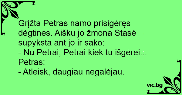 Grįžta Petras namo prisigėręs dėgtines. Aišku jo žmona Stasė supyksta ant jo ir sako: