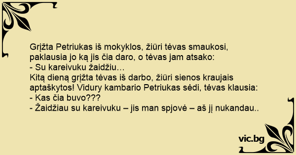 Grįžta Petriukas iš mokyklos, žiūri tėvas smaukosi, paklausia jo ką jis čia daro, o tėvas jam atsako: