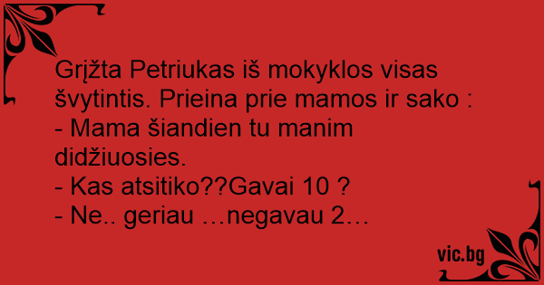 Grįžta Petriukas iš mokyklos visas švytintis. Prieina prie mamos ir sako :