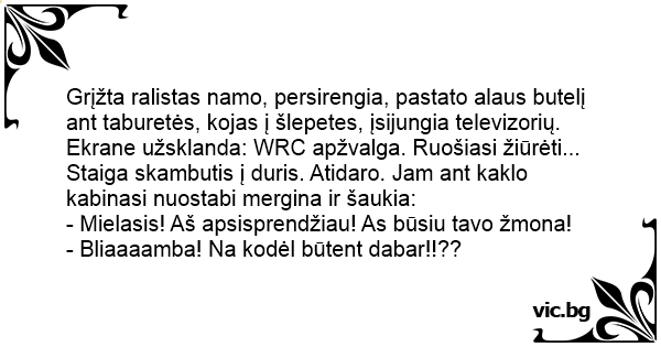 Ekrane užsklanda: WRC apžvalga. Ruošiasi žiūrėti... Staiga skambutis į duris. Atidaro. Jam ant kaklo kabinasi nuostabi mergina ir šaukia: