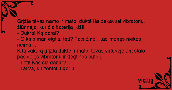 Grįžta tėvas namo ir mato: duktė išsipakavusi vibratorių, žiūrinėja, kur čia bateriją įkišti.