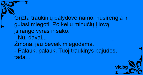 Grįžta traukinių palydovė namo, nusirengia ir gulasi miegoti. Po kelių minučių į lovą įsirango vyras ir sako: