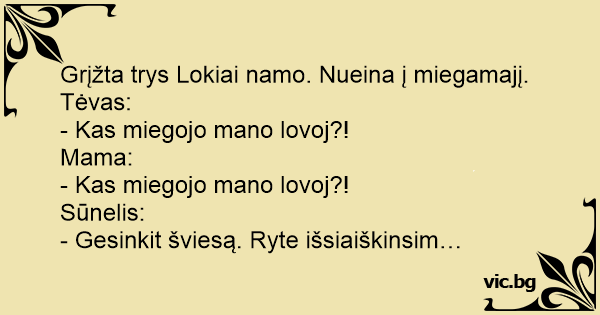 Grįžta trys Lokiai namo. Nueina į miegamajį. Tėvas: