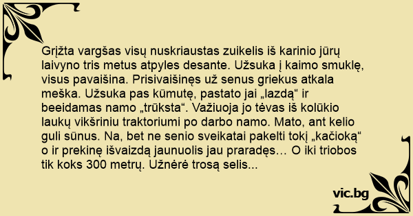 Nuo rasos sušlapęs ir sužvarbęs zuikelis greit „atsičiuchino“. Ogi žiūri, gimtas kiemas. Jau eis į triobą tik jaučia kad ant rankos kažkas užmauta. Trosas… Traktorius… Net prisėda vargšelis. Joooo, sako. Geras. Kaip vakar visus pavaišinau prisimenu. Kaip už senus griekus atkalau mešką, prisimenu. Kaip kūmutei pastačiau“lazdą“prisimenu, bet kaip aš tą vikšrinį namo partempiau niekaip neprisimenu.