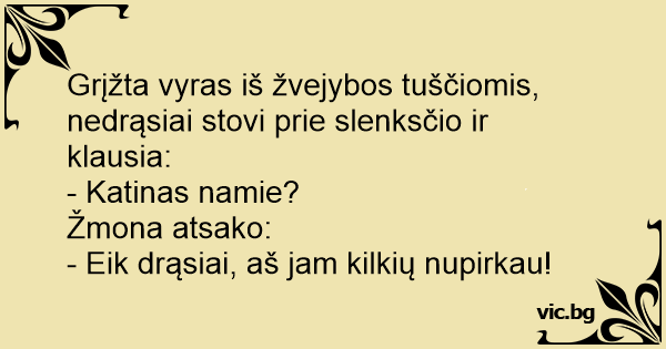Grįžta vyras iš žvejybos tuščiomis, nedrąsiai stovi prie slenksčio ir klausia: