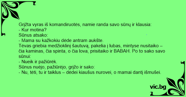 - Nu, tėti, tu ir taiklus – dėdei kiaušus nurovei, o mamai dantį išmušei.