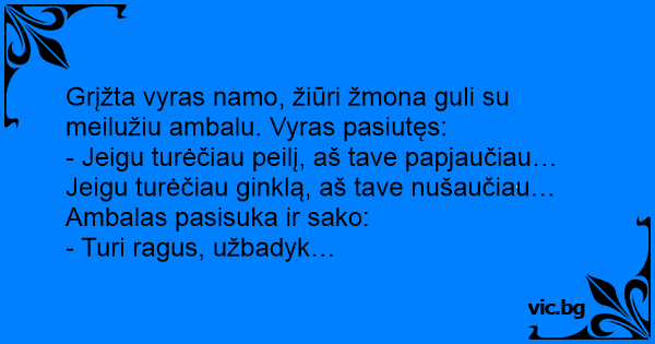 Grįžta vyras namo, žiūri žmona guli su meilužiu ambalu. Vyras pasiutęs: