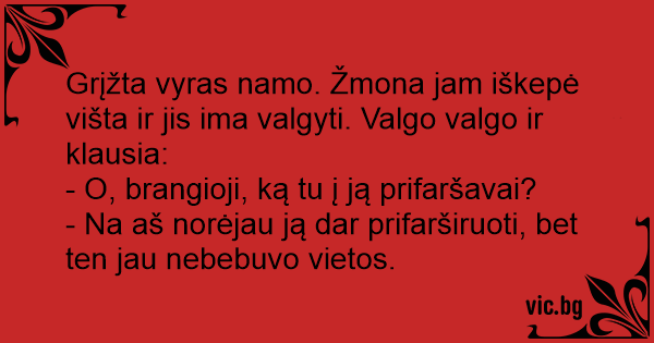 Grįžta vyras namo. Žmona jam iškepė višta ir jis ima valgyti. Valgo valgo ir klausia: