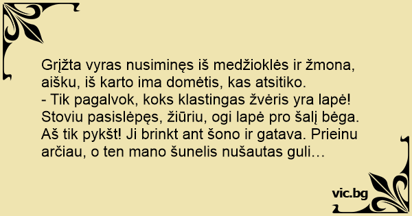 Grįžta vyras nusiminęs iš medžioklės ir žmona, aišku, iš karto ima domėtis, kas atsitiko.