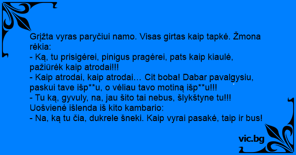 Grįžta vyras paryčiui namo. Visas girtas kaip tapkė. Žmona rėkia: