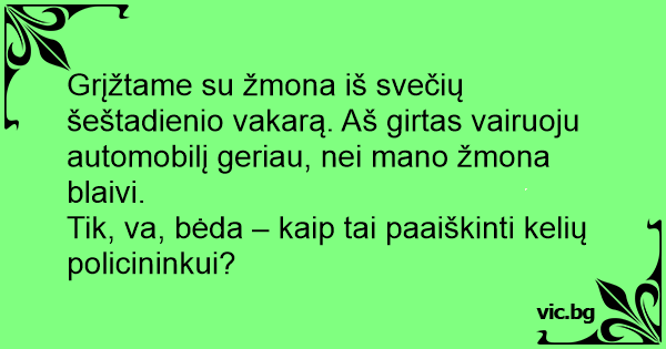 Grįžtame su žmona iš svečių šeštadienio vakarą. Aš girtas vairuoju automobilį geriau, nei mano žmona blaivi.