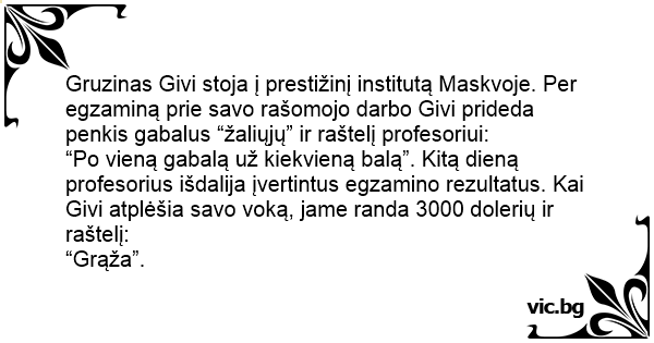 “Po vieną gabalą už kiekvieną balą”. Kitą dieną profesorius išdalija įvertintus egzamino rezultatus. Kai Givi atplėšia savo voką, jame randa 3000 dolerių ir raštelį: