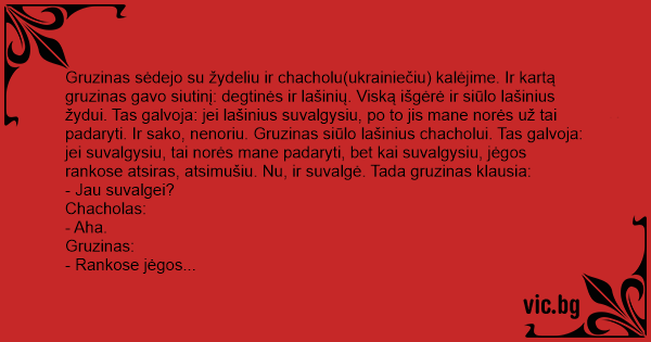 Gruzinas sėdejo su žydeliu ir chacholu(ukrainiečiu) kalėjime. Ir kartą gruzinas gavo siutinį: degtinės ir lašinių. Viską išgėrė ir siūlo lašinius žydui. Tas galvoja: jei lašinius suvalgysiu, po to jis mane norės už tai padaryti. Ir sako, nenoriu. Gruzinas siūlo lašinius chacholui. Tas galvoja: jei suvalgysiu, tai norės mane padaryti, bet kai suvalgysiu, jėgos rankose atsiras, atsimušiu. Nu, ir suvalgė. Tada gruzinas klausia: