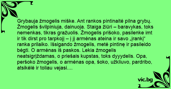 Grybauja žmogelis miške. Ant rankos pintinaitė pilna grybų. Žmogelis švilpiniuja, dainuoja. Staiga žiūri – baravykas, toks nemenkas, tikras gražuolis. Žmogelis prišoko, pasilenke imt ir tik dirst pro tarpkojį – į jį armėnas ateina ir savo „įrankį“ ranka prilaiko. Išsigando žmogelis, metė pintinę ir pasileido bėgti. O armėnas iš paskos. Lekia žmogelis neatsigrįždamas, o priešais kupstas, toks dyyydelis. Opa, peršoko žmogelis, o armėnas opa, šoko, užkliuvo, pardribo, atsikėlė ir toliau vejasi. O ten pasirodo ne kupsto, o meškino būta. Atsistojo meškinas ir vejasi armėną. O žmogelis bėga, bėga, tik žiūri – priešais trobelė. Na jis ir įlėkė į tą trobelę, o armėnas jam iš paskos, o šiam įkandin ir meškinas. Trobelėj pasigirdo bildesys, riksmai, keiksmai, riaumojimas… Ir išbėga iš trobelės žmogelis už subinės susiėmęs. Paskui jį armėnas už subinės susiėmęs. O paskui šį – meškinas už subinės susiėmęs ir klaikiai riaumodamas. Meškinui pavymui iš trobelės išeina gruzinas ir sušunka: