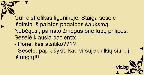 Guli distrofikas ligoninėje. Staiga seselė išgirsta iš palatos pagalbos šauksmą. Nubėgusi, pamato žmogus prie lubų prilipęs. Seselė klausia paciento: