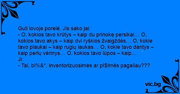 - O, kokios tavo krūtys – kaip du prinokę persikai… O, kokios tavo akys – kaip dvi ryškios žvaigždės… O, kokie tavo plaukai – kaip rugių laukas… O, kokie tavo dantys – kaip perlų vėrinys… O, kokios tavo lūpos – kaip…