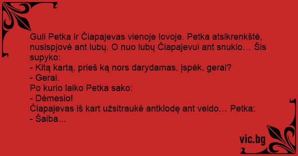 Guli Petka ir Čiapajevas vienoje lovoje. Petka atsikrenkštė, nusispjovė ant lubų. O nuo lubų Čiapajevui ant snukio… Šis supyko: