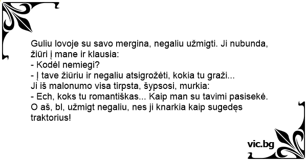 Guliu lovoje su savo mergina, negaliu užmigti. Ji nubunda, žiūri į mane ir klausia: