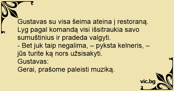 Gustavas su visa šeima ateina į restoraną. Lyg pagal komandą visi išsitraukia savo sumuštinius ir pradeda valgyti.