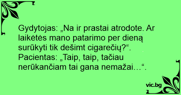Gydytojas: „Na ir prastai atrodote. Ar laikėtės mano patarimo per dieną surūkyti tik dešimt cigarečių?“.