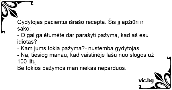 Gydytojas pacientui išrašo receptą. Šis jį apžiūri ir sako: