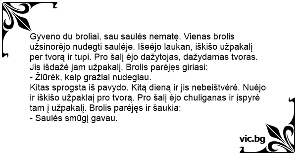 Gyveno du broliai, sau saulės nematę. Vienas brolis užsinorėjo nudegti saulėje. Išeėjo laukan, iškišo užpakalį per tvorą ir tupi. Pro šalį ėjo dažytojas, dažydamas tvoras. Jis išdažė jam užpakalį. Brolis parėjęs giriasi: