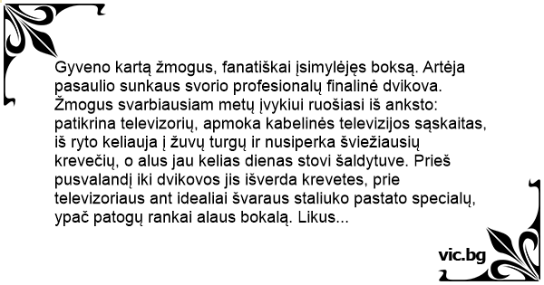 Gyveno kartą žmogus, fanatiškai įsimylėjęs boksą. Artėja pasaulio sunkaus svorio profesionalų finalinė dvikova. Žmogus svarbiausiam metų įvykiui ruošiasi iš anksto: patikrina televizorių, apmoka kabelinės televizijos sąskaitas, iš ryto keliauja į žuvų turgų ir nusiperka šviežiausių krevečių, o alus jau kelias dienas stovi šaldytuve. Prieš pusvalandį iki dvikovos jis išverda krevetes, prie televizoriaus ant idealiai švaraus staliuko pastato specialų, ypač patogų rankai alaus bokalą. Likus penkiom minutėm iki transliacijos ant staliuko garuoja krevetės, šalia – aprasoję alaus buteliai. Žmogaus laukia puikus vakaras – 12 raundų bokso! Prasidėjus kovai, jis pakelia bokalą su putojančiu šaltu alumi prie lūpų ir staiga – nokautas! Kova baigta! Praejus 10 sekundžių! Vis dar laikydamas vienoje rankoje krevetę, kitoje – bokalą, jis nustėrusiu žvilgsniu pasižiūri į žmoną. O ji paklausia: