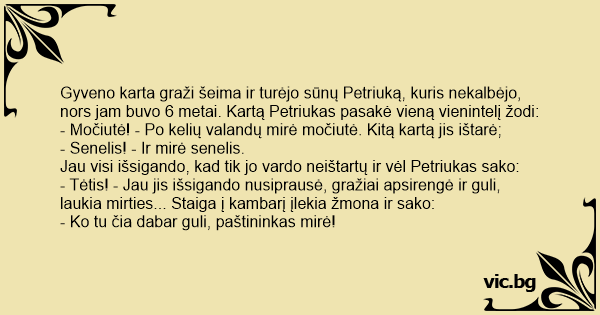 Gyveno karta graži šeima ir turėjo sūnų Petriuką, kuris nekalbėjo, nors jam buvo 6 metai. Kartą Petriukas pasakė vieną vienintelį žodi: