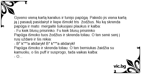 Gyveno vieną kartą karalius ir turėjo papūgą. Paleido jis viena kartą ją į pasaulį pasidairyt ir liepe išmokt tris žodžius. Nu ką skrenda papūga ir mato: mergaitė šukuojasi plaukus ir kalba: