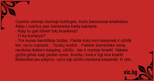 - Yra senas liaudiškas būdas. Paimk kokį nors kaspinelį ir užrišk ten, na tu supranti... Turėtų nustot... Paėmė šeimininkė seną raudoną dukters kaspiną, užrišo - tas ir nustojo knarkt. Vakare grįžta girtas kaip pėdas vyras, krenta į lova ir irgi ima knarkt. Moteriškė jau patyrus, vyrui irgi užrišo raudoną kaspinėlį. Iš ryto pachmielnas vyras atsikelia, nueina į tuliką, ir pamato gražų raudoną kaspinėlį užrištą vietoj, kurioj jis to mažiausiai tikėjosi. Pasimetęs išeina iš tualeto, ir pamato, kad šuo irgi su kaspinu. Pasimetęs jis pakrapšto galvą ir taria buldogui: