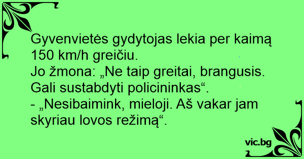 Jo žmona: „Ne taip greitai, brangusis. Gali sustabdyti policininkas“.