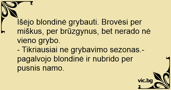 Išėjo blondinė grybauti. Brovėsi per miškus, per brūzgynus, bet nerado nė vieno grybo.