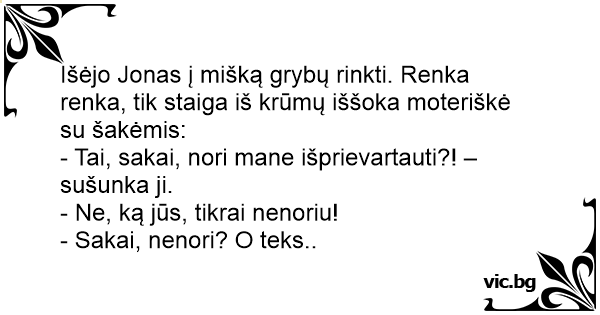 Išėjo Jonas į mišką grybų rinkti. Renka renka, tik staiga iš krūmų iššoka moteriškė su šakėmis: