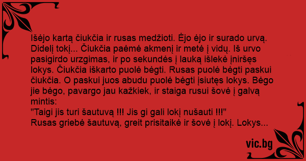 Išėjo kartą čiukčia ir rusas medžioti. Ėjo ėjo ir surado urvą. Didelį tokį... Čiukčia paėmė akmenį ir metė į vidų. Iš urvo pasigirdo urzgimas, ir po sekundės į lauką išlekė įniršęs lokys. Čiukčia iškarto puolė bėgti. Rusas puolė bėgti paskui čiukčia. O paskui juos abudu puolė bėgti įsiutęs lokys. Bėgo jie bėgo, pavargo jau kažkiek, ir staiga rusui šovė į galvą mintis: