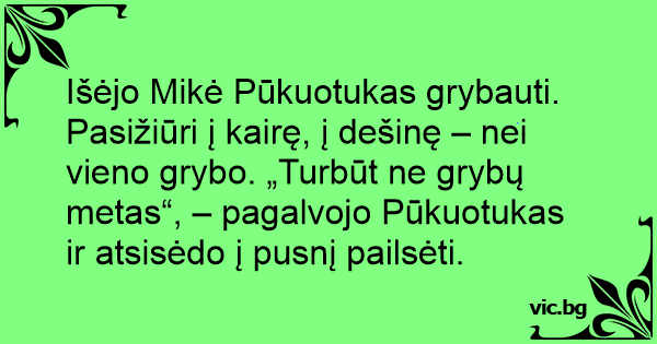 Išėjo Mikė Pūkuotukas grybauti. Pasižiūri į kairę, į dešinę – nei vieno grybo. „Turbūt ne grybų metas“, – pagalvojo Pūkuotukas ir atsisėdo į pusnį pailsėti.