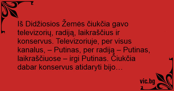 Iš Didžiosios Žemės čiukčia gavo televizorių, radiją, laikraščius ir konservus. Televizoriuje, per visus kanalus, – Putinas, per radiją – Putinas, laikraščiuose – irgi Putinas. Čiukčia dabar konservus atidaryti bijo…