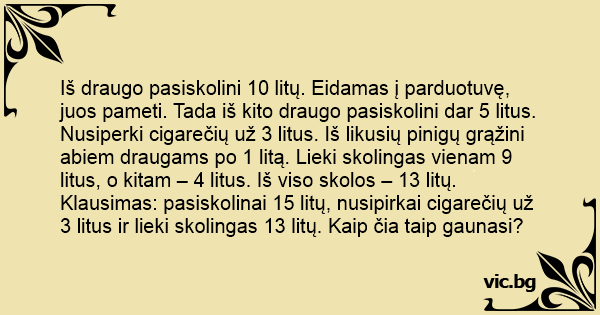 Klausimas: pasiskolinai 15 litų, nusipirkai cigarečių už 3 litus ir lieki skolingas 13 litų. Kaip čia taip gaunasi?