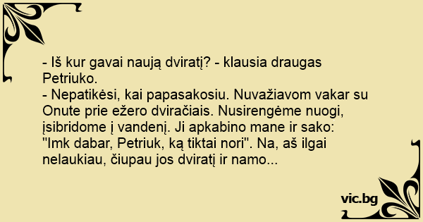 - Nepatikėsi, kai papasakosiu. Nuvažiavom vakar su Onute prie ežero dviračiais. Nusirengėme nuogi, įsibridome į vandenį. Ji apkabino mane ir sako:
