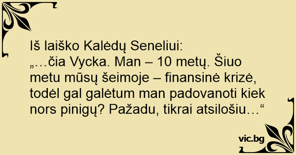 „…čia Vycka. Man – 10 metų. Šiuo metu mūsų šeimoje – finansinė krizė, todėl gal galėtum man padovanoti kiek nors pinigų? Pažadu, tikrai atsilošiu…“